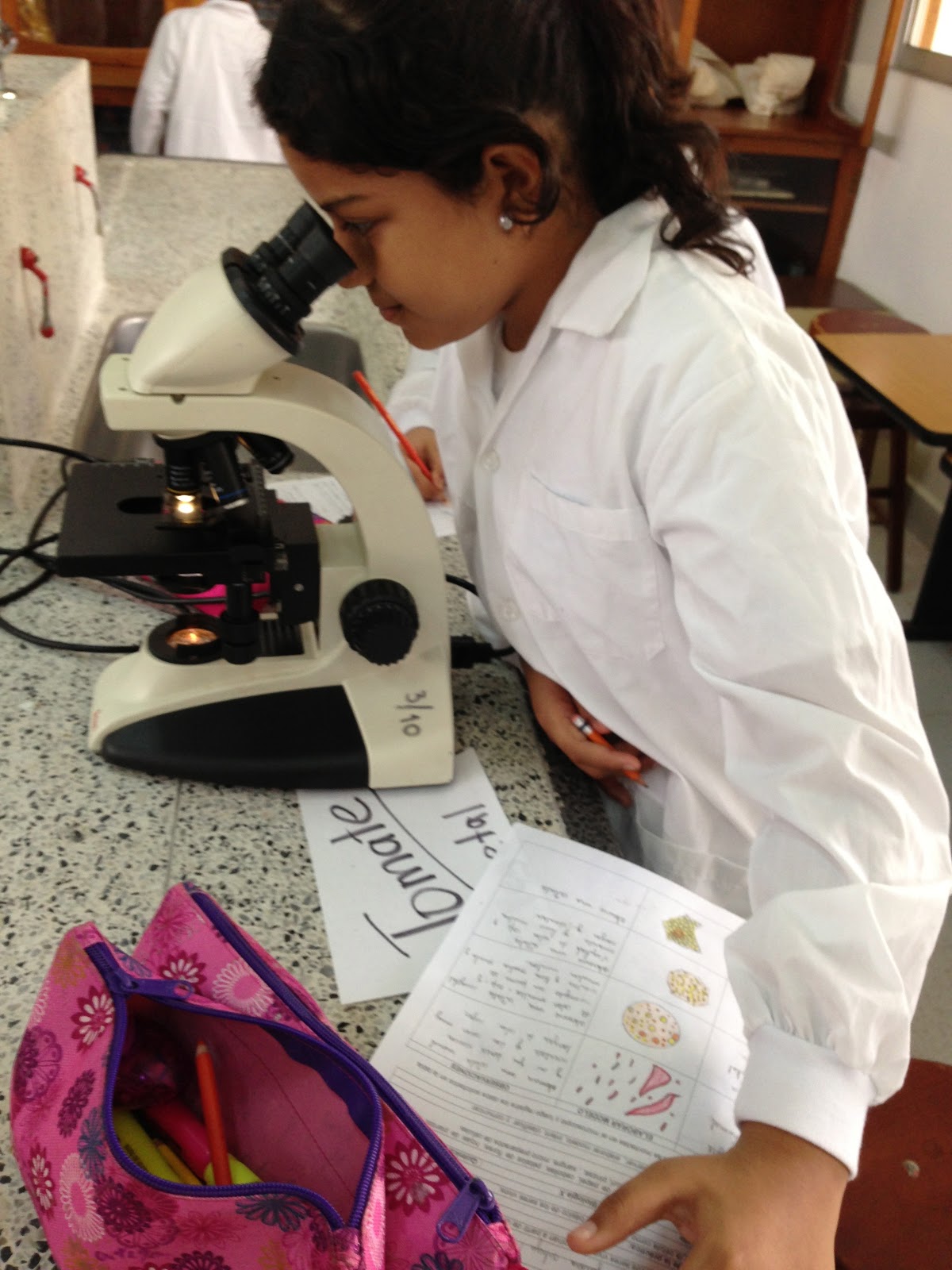 Los estudiantes de 4 grado en compañía de la profesora Luz Marina Tejada tuvieron la oportunidad de asistir hoy al laboratorio para observar células animales y vegetales, establecer la diferencia entre ellas y dibujar lo observado; con bastante entusiasmo y dedicación los chicos plasmaron en sus guías de trabajo lo observado al microscopio, pudieron visualizar el polen, células de ají, sanguíneas, células de tomate, células de cebolla, algunas se tiñeron con lugol apreciando así el núcleo celular.